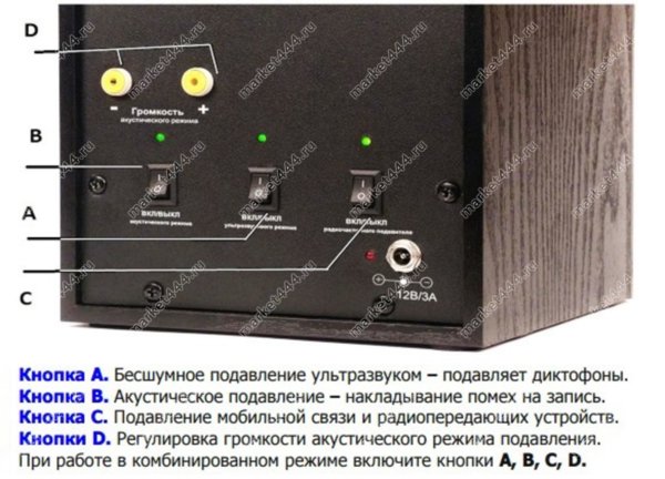 Дополнительное акустическое подавление. Помимо бесшумного ультразвука можно дополнительно активировать другой вид помехи — акустический речеподобный сигнал. Эта помеха является слышимой, уровень ее громкости регулируется вручную. Наложение такого сигнала на аудиозапись делает ее полностью неразборчивой, а удалить речеподобную помеху невозможно ничем.
